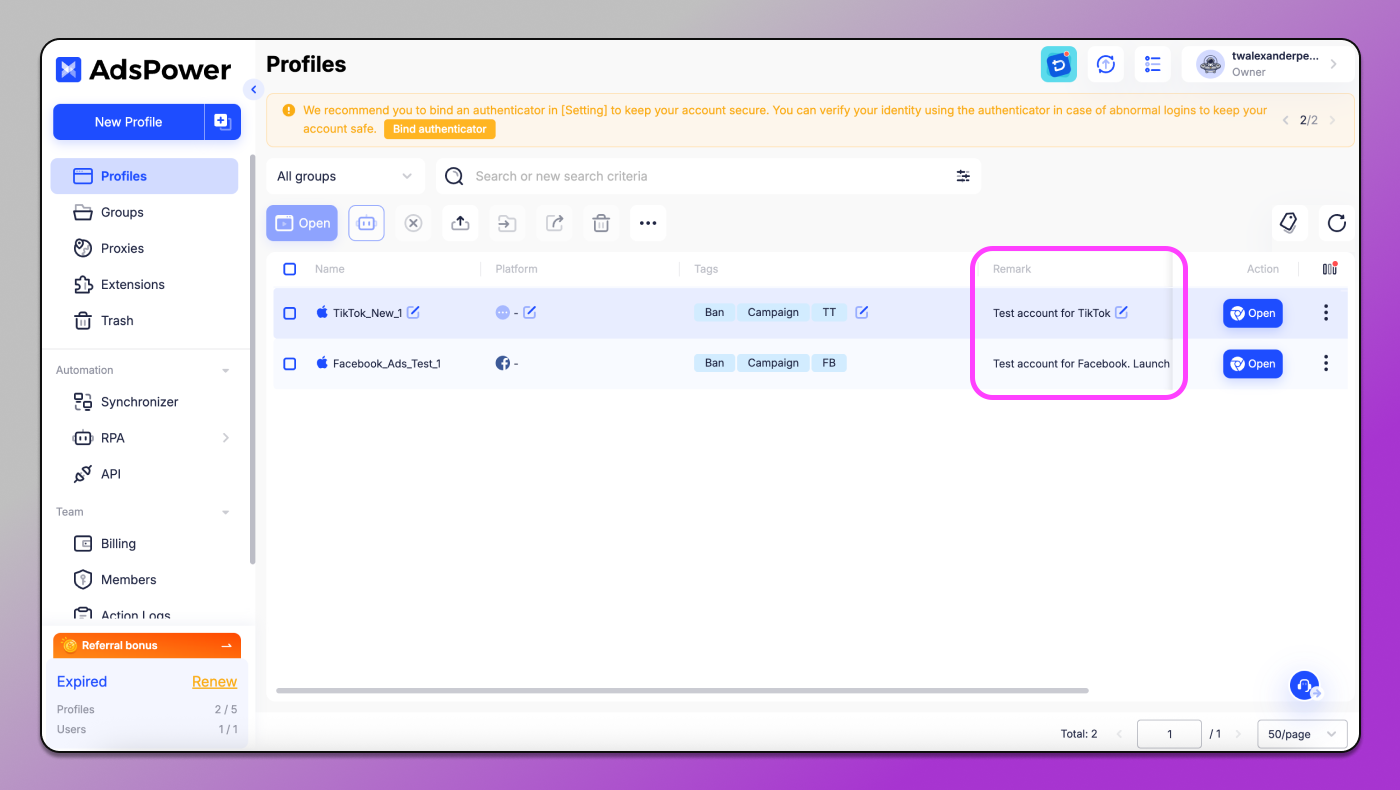 AdsPower doesn’t have statuses, and it’s not always easy to tell what to do with a profile just by looking at the notes.